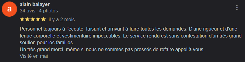 - Réactivité et disponibilité : Plusieurs avis mettent en avant la réactivité de l’équipe de Pompes Funèbres Pétrau, soulignant leur capacité à répondre rapidement aux demandes et à être présents pour les familles, même en dehors des horaires d’ouverture grâce à la permanence téléphonique.